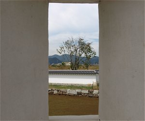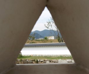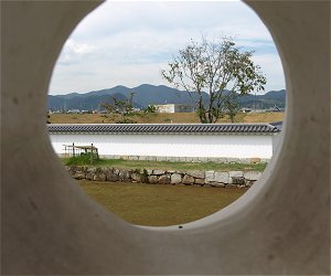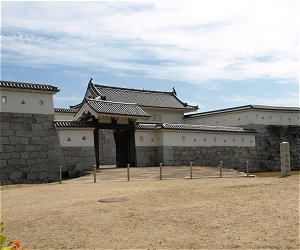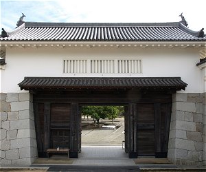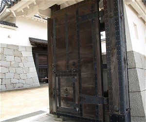 本丸門(H21.9.15) 本丸門は、一の門(本丸側)と二の門(二の丸側)の2つの門からなっています。左上の写真は二の丸側から撮影したもので、手前の小さいのが二の門、奥の大きいのが一の門で、ともに平成4年〜8年にかけて復元されたものです。右上の写真は二の門の門扉、奥に一の門が見えています。 撮影日時は、9月11日の午後1時30分台です。 ←「赤穂地図」に戻る